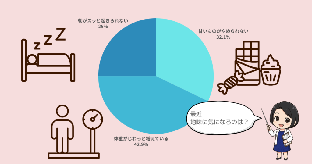 28名の方が回答してくださり、最も多かったのは「体重がじわっと増えている」(42.9%)でした。